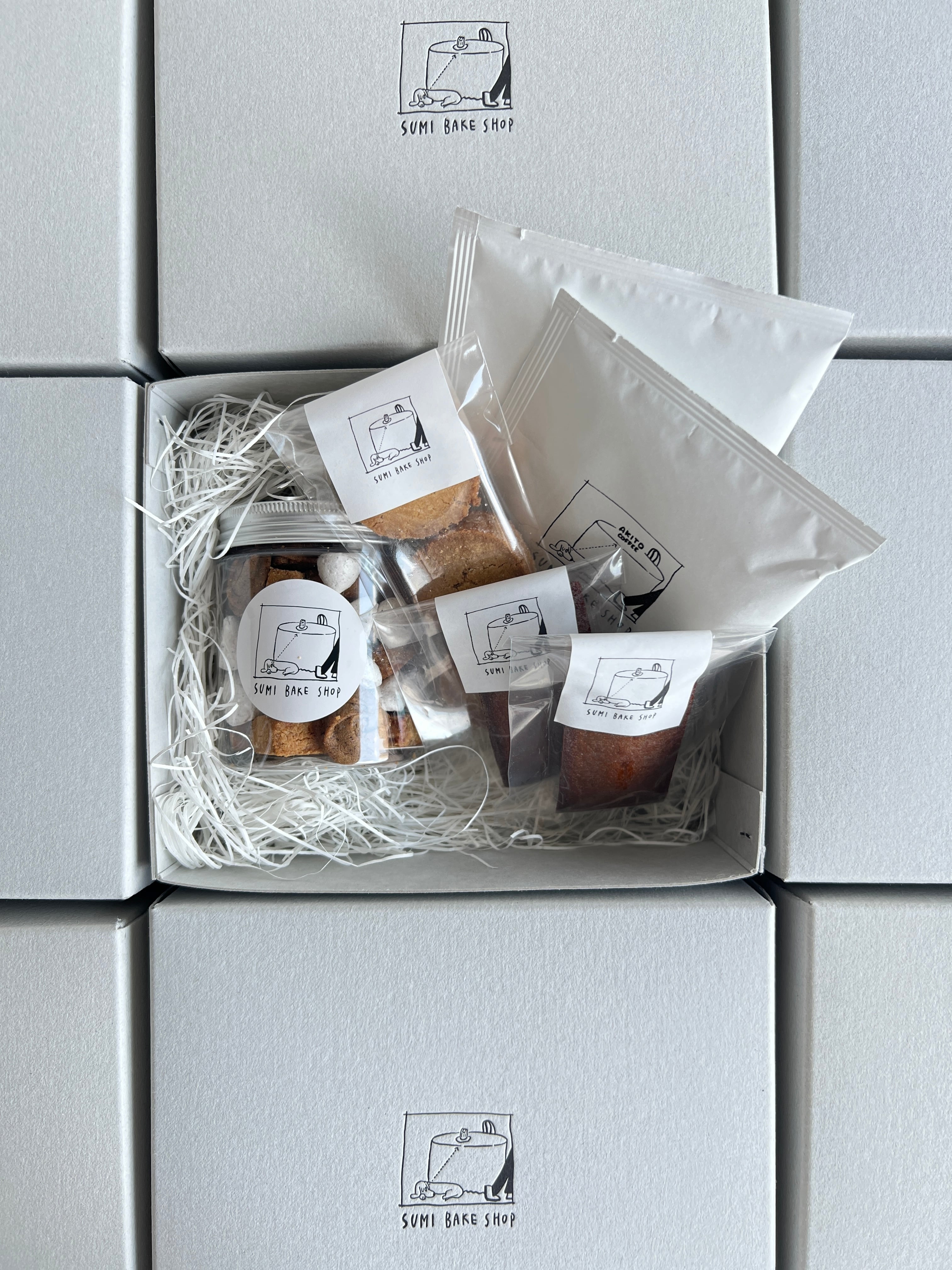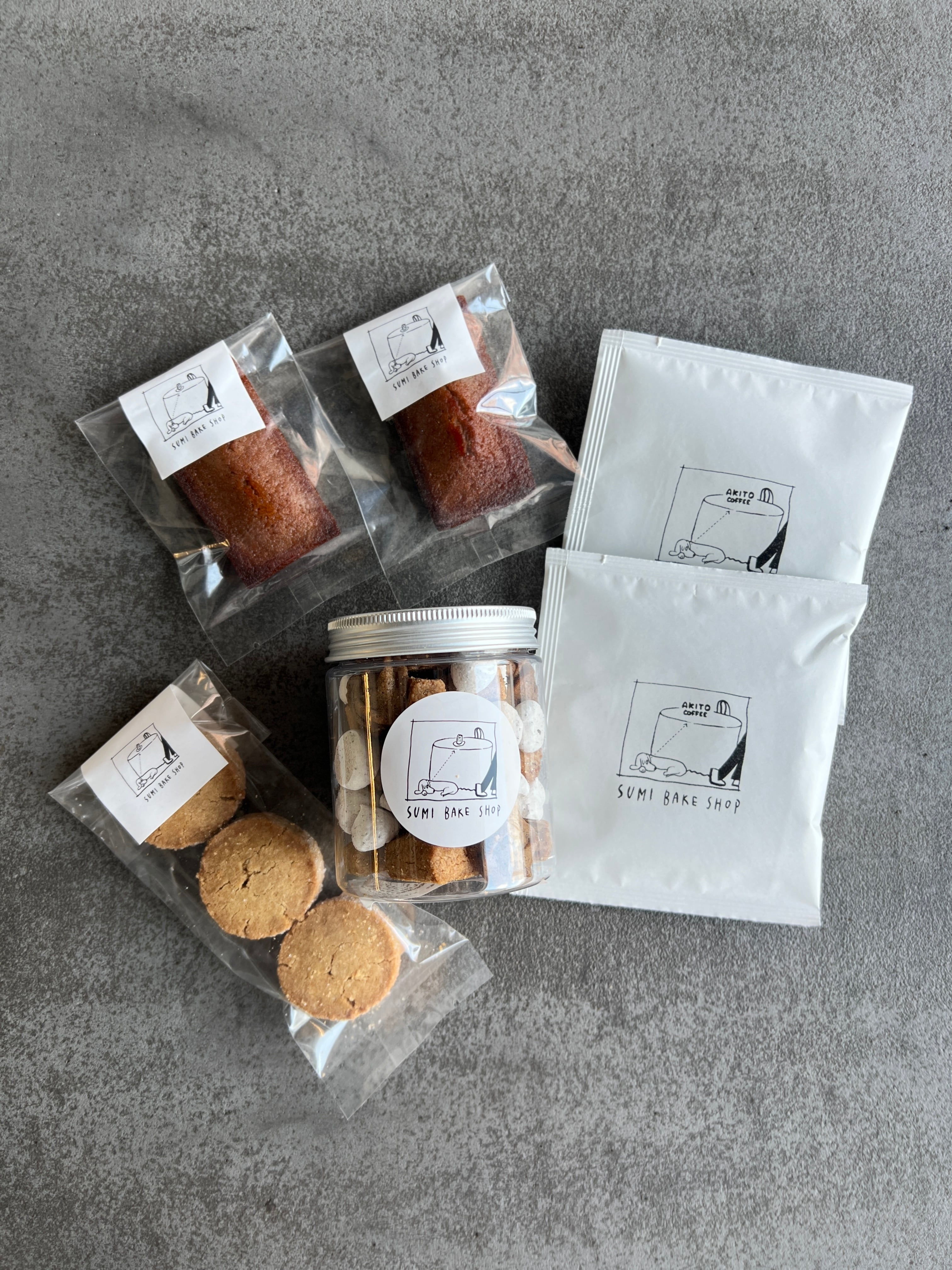 紙製のギフトボックスに焼菓子とコーヒーバッグをセットにした詰め合わせです。