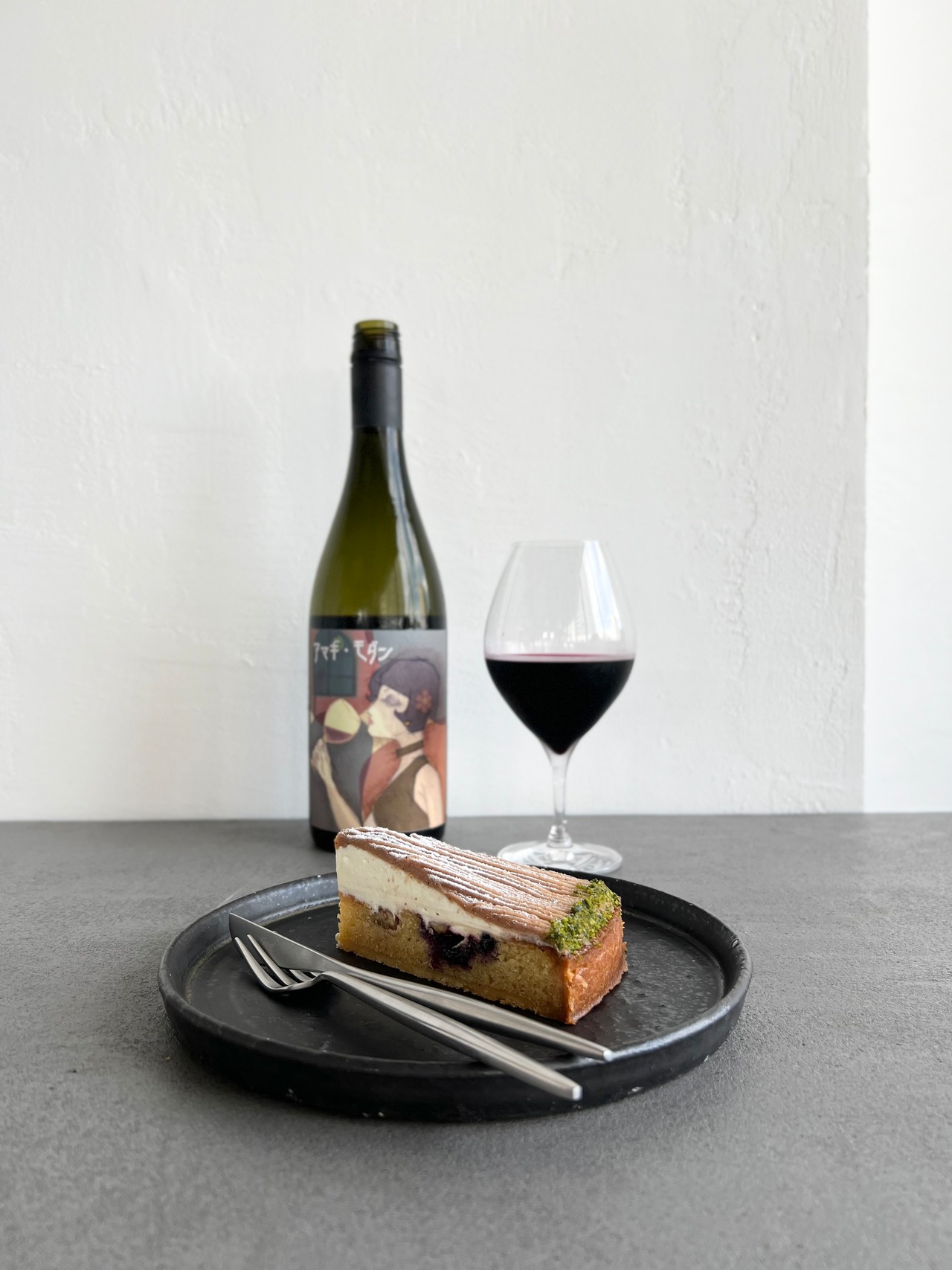 赤ワインに合わせて楽しんでいただけたら、と考案したケーキです。ご自宅でぜひワインと一緒に食べてみてください。